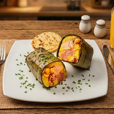 La Receta original del tamal de 1 libra para desayunar generosamente y empezar el dia bien cargado. Se compone de Harina de Maiz, Garbanzo, Pollo, tocino y cerdo y de ñapa una arepita santandereana..