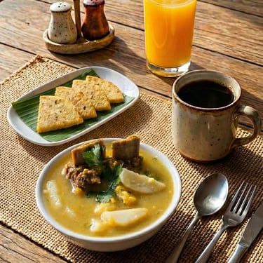 Sopa espesa con carne, maíz, yuca y verduras frescas.