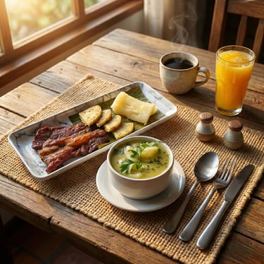 Una mezcla poderosa de arroz blanco, huevos de campo, garbanzos suaves y trozos de sobrebarriga que junto a nuestro hogao de la casa y acompañado de Arepa Santandereana se transforman en un desayuno lleno de caracter